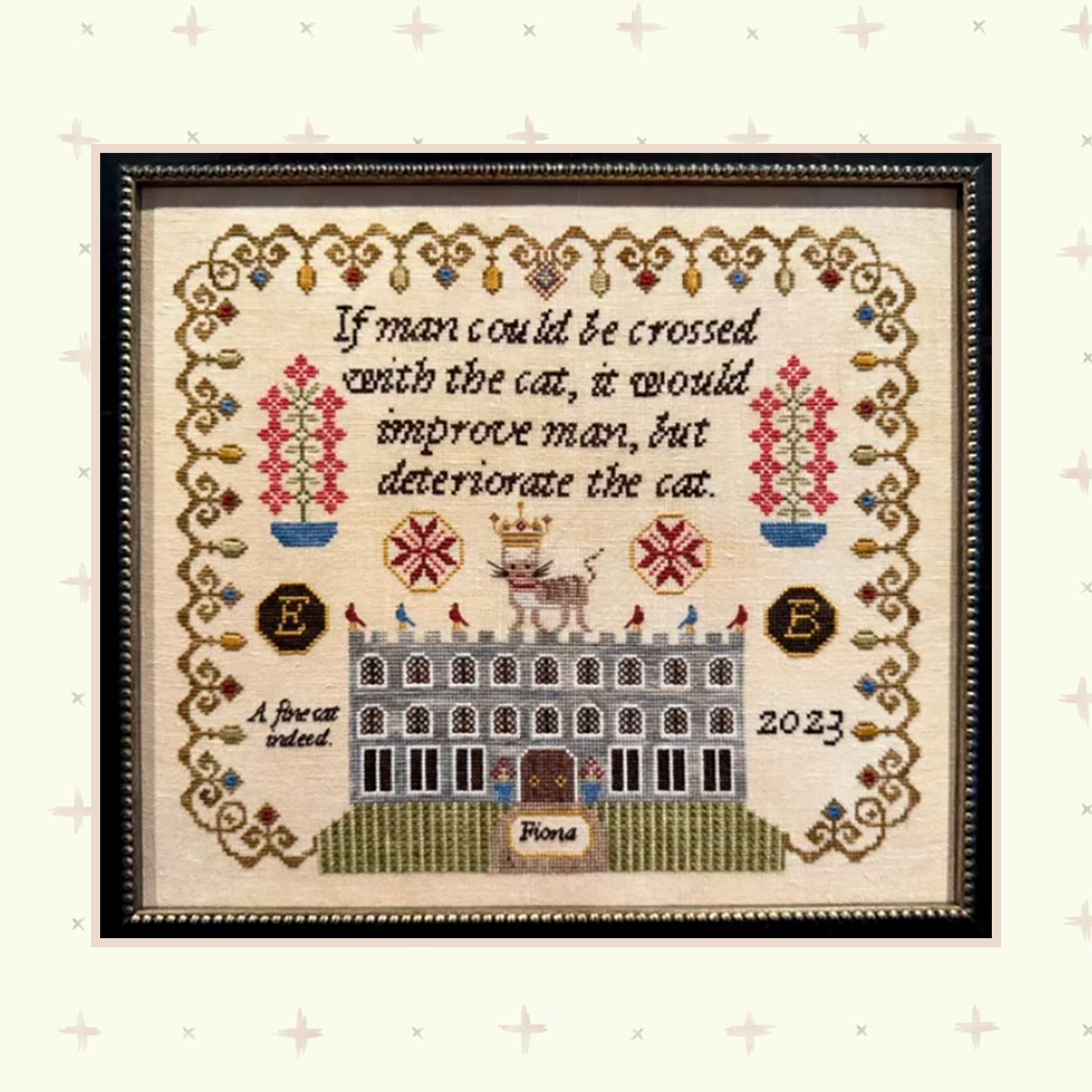 The model s stitched using some specialty stitches that are entirely optional, including 24 leg eyes over 6 linen threads (in the border), satin stitch (in the border and in the cat’s nose), and smyrna crosses over 4 linen threads (in the lawn using Pinery (DMC 937). All of the over one stitching (with the exception of the red central diamond in the cat’s crown) are stitched over one in tent stitch. Feel free to use full crosses over one if you’re feeling daring!