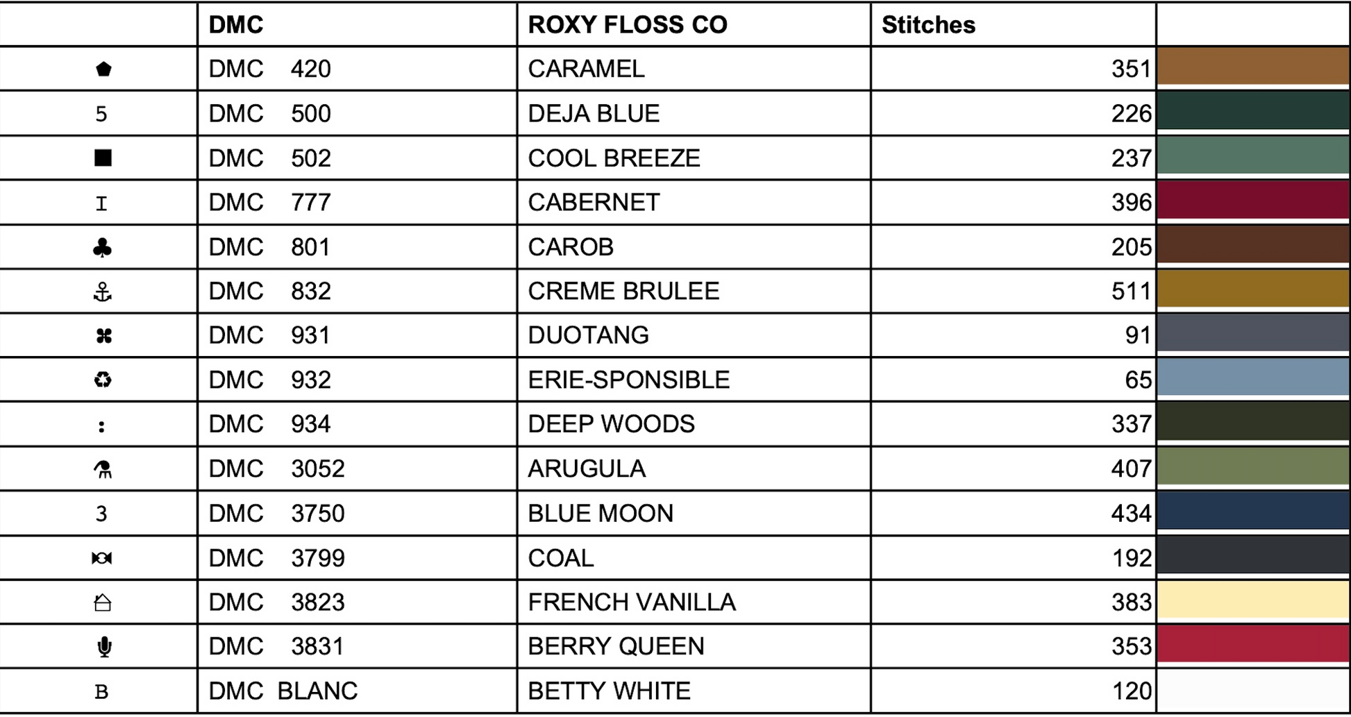 DMC conversion provided but due to the over-dyed nature of the Roxy flosses an exact match is not possible.
