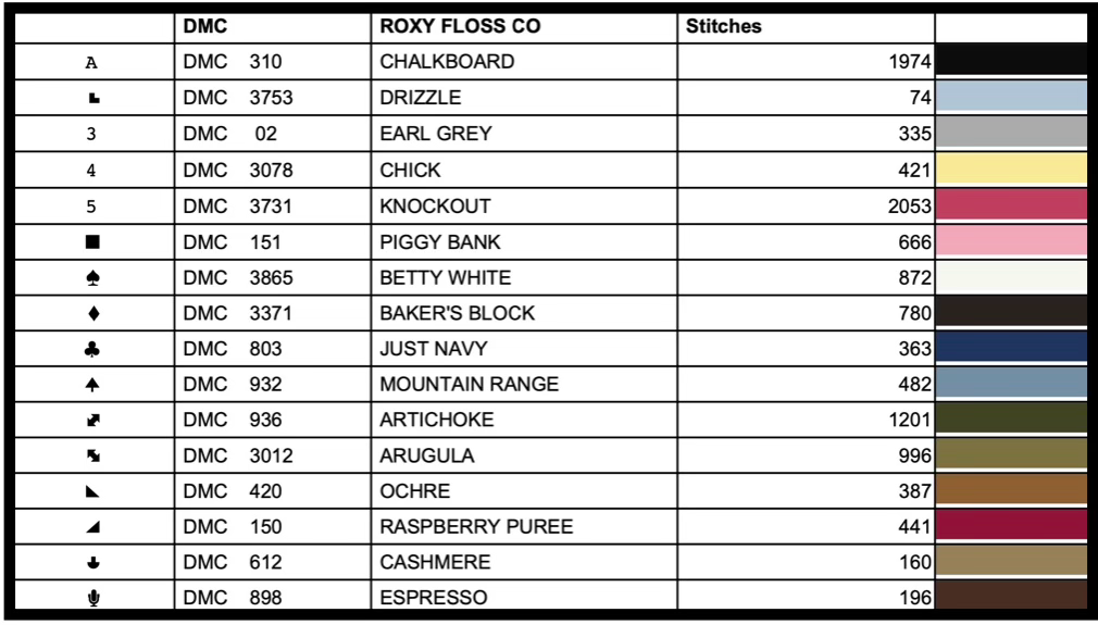Model is  stitched on 40 count Roxy Floss Co. linen in the colour way Dirty Porcelain using flosses by Roxy Floss Co. A DMC conversion is provided but due to the over-dyed nature of the Roxy Floss Co. flosses, an exact match is not possible. Feel free to use whatever fibres you like.